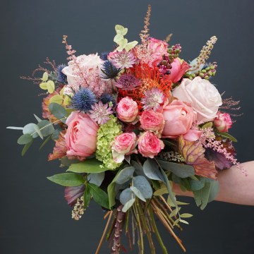 The softest shades of pink contrasting with auburn tones together create a warm glow and a gorgeous spectacle. Will create more than a second glance. This bouquet includes shades of pink and has included orange, purple and blue colours. The bouquet will be delivered aqua-packed and in a floral presentation box.