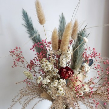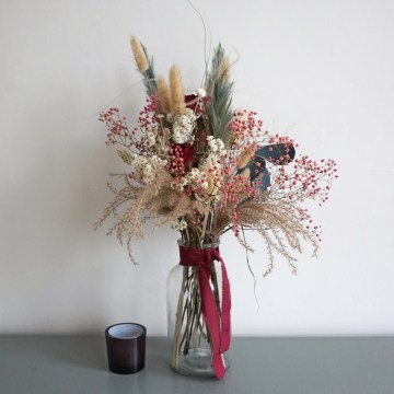 Enchanting and unique this dried arrangement with pinks, blue and red is a unique gift. It comes in it’s own medium, recycled glass vase. Dried flowers are long lasting, sustainable and do not need water, they are happy in a dry environment. Tea-light holder is shown for size reference only.